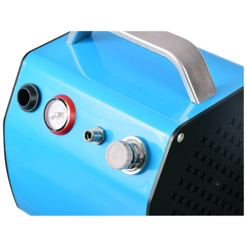- Дополнительно: Встроенный фильтр-влагоотделитель, манометр, регулятор давления, вентилятор для охлаждения, держатель аэрографа