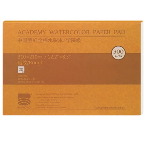 Профессиональный акварельный блок Baohong Academy Rough — 100 % хлопок, плотность 300 г/м², ярко выраженная грубая текстура. Формат 31×21 см (чуть больше А4) — идеальный «золотой» размер для полноценных студийных работ, пленэрных этюдов и сложных многослойных композиций.