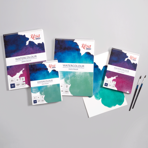 Скетчбук для акварели на спирали ROSA Studio А5 (бирюзовый) — удобный и качественный блокнот для ежедневной практики, обучения, быстрых зарисовок и пленэра. 32 листа белой акварельной бумаги 200 г/м² с мелким зерном позволяют работать без сильного коробления даже при обильном увлажнении.