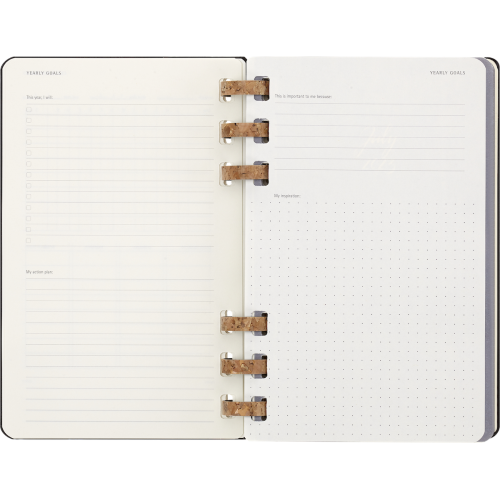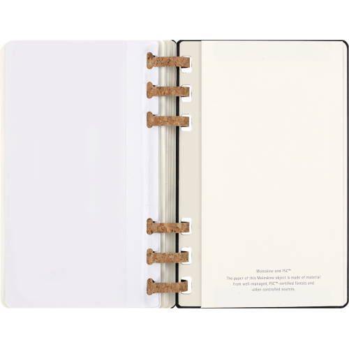 - Твёрдая черная обложка из бумаги Favini — экологичный натуральный материал;