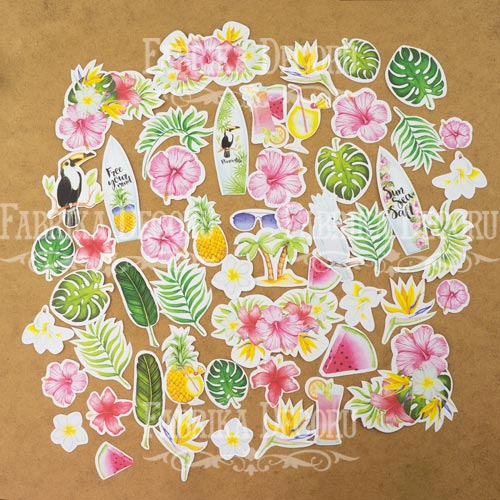 Набор бумажных высечек для скрапбукинга изготовлены из высококачественной европейской бумаги, без кислоты и лигнина, плотность 250 г/кв.м. В наборе 58 штук. Размер элементов от 2 до 12см. Высечки являются дополнением коллекции "Wild Tropics" от тм «Фабрика декору».
