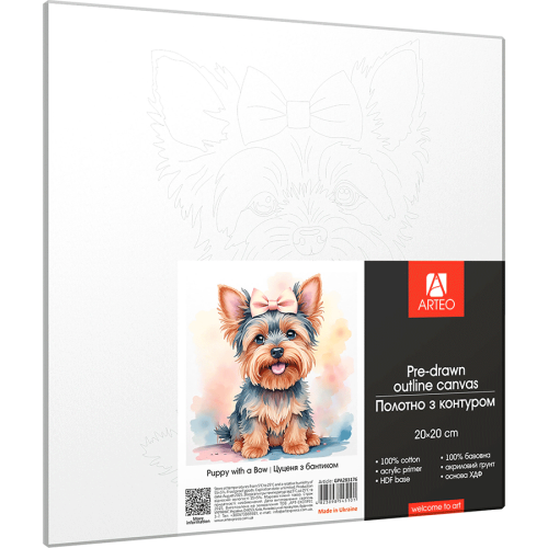 Теги: Холст хлопок на ХДФ с контуром Щенок с бантиком 20x20, акриловый грунт, Arteo