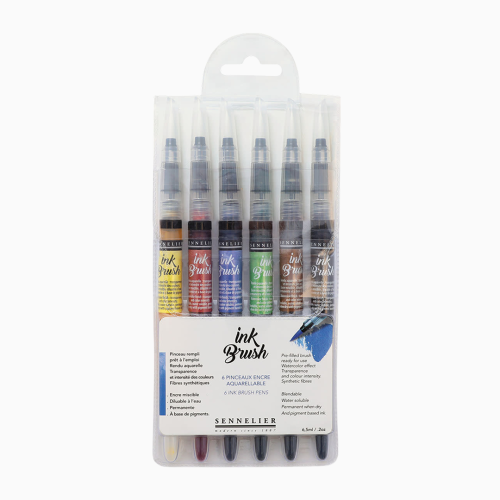 Инновационный набор Sennelier Ink Brush Pens Trendy, 6 цветов — кисти-перья с яркими, экологичными водорастворимыми пигментными чернилами. Каждая ручка имеет тонкий синтетический наконечник, имитирующий традиционную акварельную кисть, что позволяет создавать линии разной толщины — от тонких до широких мазков до 10 мм.