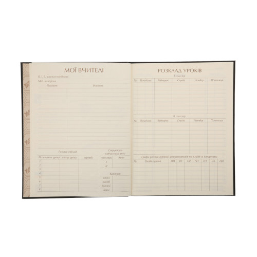 Дневник выполнен в жёсткой обложке с ярким дизайном, покрытой софт-тач слоем и выборочным УФ-лакированием, что делает его не только красивым, но и приятным на ощупь. Кремовая бумага внутреннего блока выглядит элегантно и снижает нагрузку на глаза, обеспечивая комфорт во время письма. Внутри размещён информационный раздел с данными ученика, учителей, школы, расписанием уроков и звонков, а также табелем успеваемости.