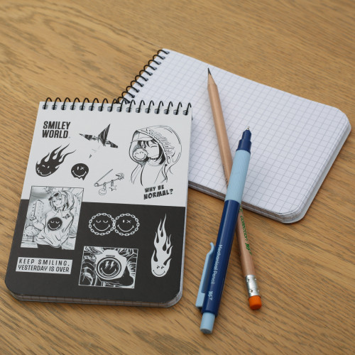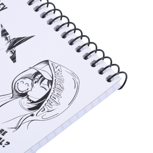 Яркий современный дизайн подчёркивает индивидуальность владельца, а прочная обложка из белого крафт-картона надежно защищает страницы. Белая офсетная бумага со скругленными уголками делает письмо приятным: листы не просвечивают и не рвутся. Металлическая спираль с узким шагом позволяет раскрывать тетрадь на 180°, обеспечивая удобство при записи на любой странице.