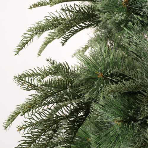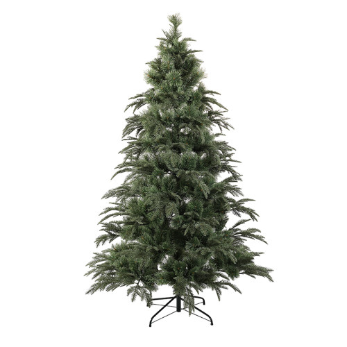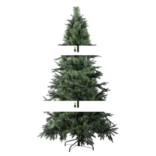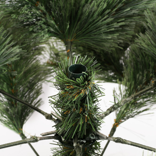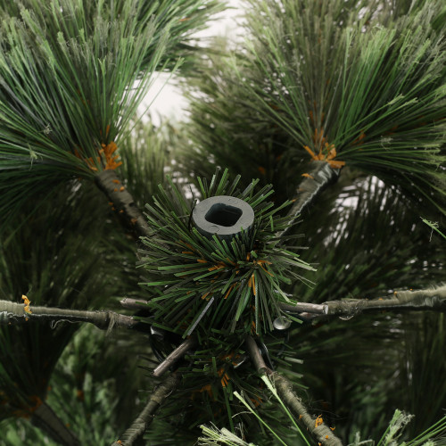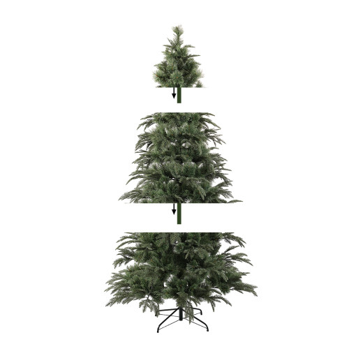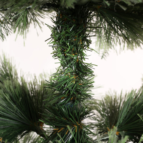Хвоя выполнена из ПВХ-плёнки шириной 10 см, что придаёт дереву естественный вид и объём. Прочный металлический ствол состоит из двух частей с верхушкой, а устойчивая металлическая крестовина с болтами гарантирует надёжную установку. Диаметр нижнего яруса 1,27 м делает сосну по-настоящему величественной.