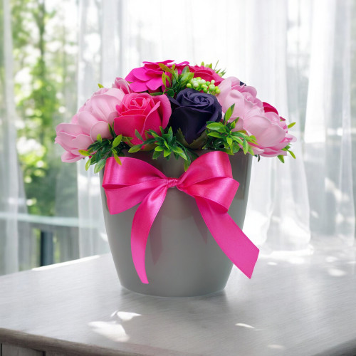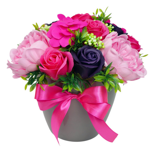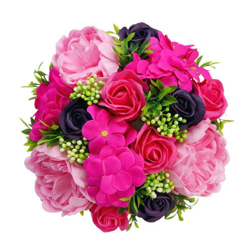 Мыльная пена обеспечивает цветам невероятную реалистичность: лепестки выглядят объёмными, естественными, с тонкой текстурой и лёгким приятным ароматом. Композиция не вянет, не требует полива, света или специального ухода — сохраняет безупречный вид долгие годы. Достаточно периодически аккуратно удалять пыль мягкой кистью или феном на холодном режиме.
