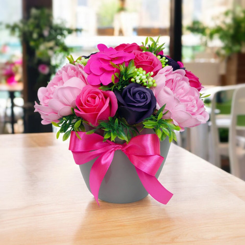 Композиция «Розовое вдохновение» — нежный и изысканный букет из высококачественных цветов, созданных из мыльной пены. Мягкие пастельные оттенки гортензий, пионов и роз создают атмосферу лёгкости, романтики и утончённой красоты. Это идеальный акцент для дома, офиса, спальни или в качестве трогательного и долговечного подарка.
