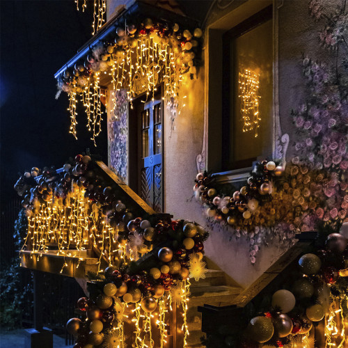 Электрогирлянда бахрома уличная используется для уличного декорирования. Цвет светящихся лампочек: теплый белый; цвет шнура - белый. Количество лампочек: 150 шт. Степень защиты электрогирлянды IP 65. Длина провода: 5,5 м. Состав: каучук, электрический провод. Источник питания: от сети (220-240 В, 50-60 Гц, 6 Вт).