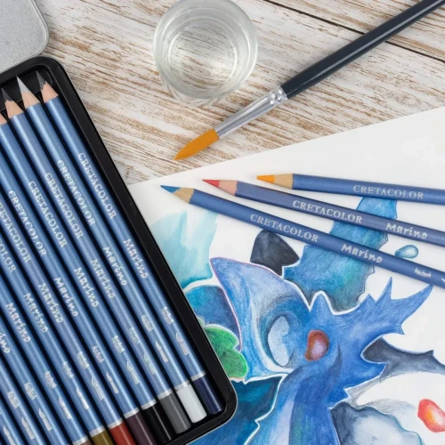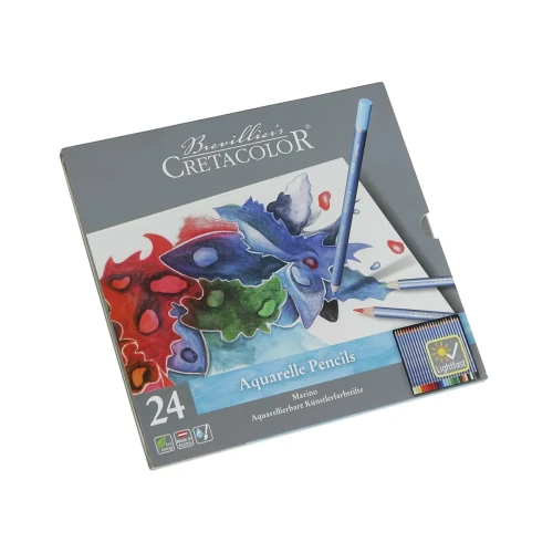 Акварельные карандаши серии MARINO производителя Cretacolor который всегда отличался высоким качеством выпускаемой продукции, в упаковке 24 цветных акварельных карандаша, металлическая коробка в которой находятся карандаши защищает их от повреждений во время переноски и хранения. Новые карандаши Марино Светостойкие Акварельные Cretacolors. Их истинная сила проявляется, при растворении в воде. Брать цвет Вы можете кистью с карандаша, так и розводить уже на бумаге.