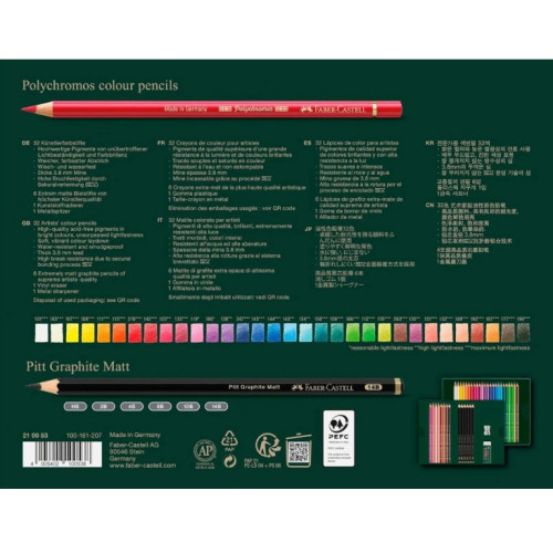 Премиальный подарочный набор Faber-Castell Polychromos из 32 профессиональных цветных карандашей в элегантной металлической коробке — идеальный выбор для художников, иллюстраторов и всех, кто стремится к совершенству в цвете.