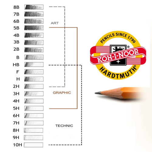 Серия Koh-I-Noor 1570 представлена широким диапазоном твердости: от мягких 8B, 6B, 5B, 4B, 3B, 2B, B, HB до твердых H, 2H и 3H. Каждый художник может подобрать идеальный вариант под свои задачи — от глубоких бархатистых теней и насыщенных штрихов до тонких линий и точных построений.