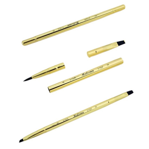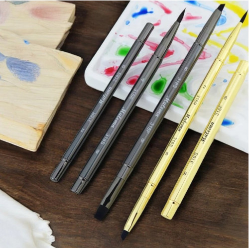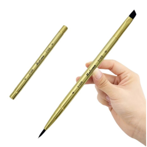 Профессиональный дорожный набор Maleonn S-316 — 6 двусторонних акварельных кистей в стильных золотистых корпусах-пеналах. Идеальное решение для пленэра, путешествий и городского скетчинга: каждая кисть прячется внутрь корпуса, не пачкает сумку и не повреждает ворс.