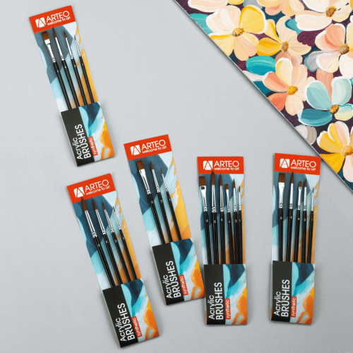 Набор кистей Arteo №5 — универсальный комплект из 6 синтетических кистей для акрила, гуаши, акварели и масла. Позволяет выполнять тонкие контуры, детализацию, средние мазки и быстрое заполнение больших площадей.