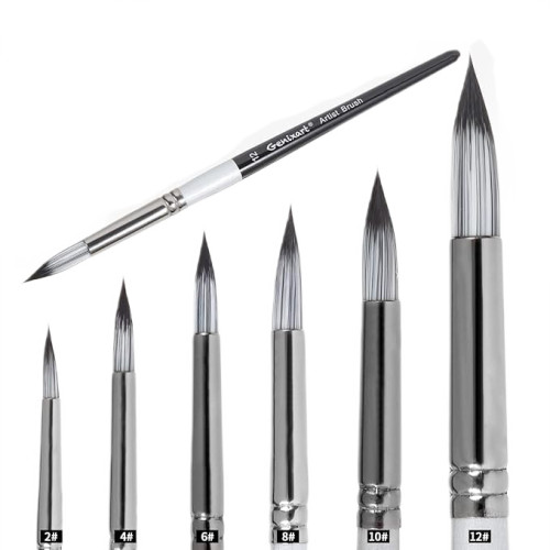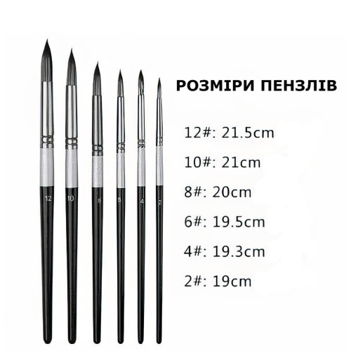 В наборе: 6 круглых кистей разных размеров — от тонких для филигранной проработки деталей и тонких линий до более крупных для заливок, контуров и основных слоёв. Эргономичные деревянные ручки удобно лежат в руке, не скользят и позволяют работать часами без усталости. Металлическая обойма надёжно фиксирует ворс, исключая выпадение волосков.