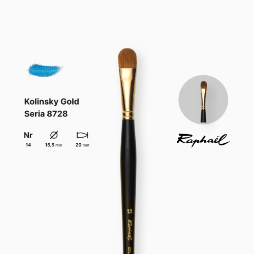 Эксклюзивная овальная кисть премиум-класса Raphaël Kolinsky Gold (серия 8404) — из 100 % отборного сибирского колонка высшего сорта с позолоченной медной обоймой и длинной ручкой. Идеальна для широких заливок, мягких переходов и выразительных мазков в акварели.