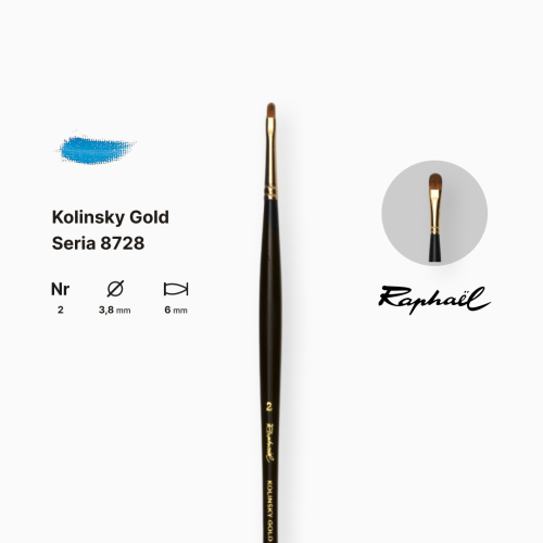 Эксклюзивная овальная кисть премиум-класса Raphaël Kolinsky Gold (серия 8404) — из 100 % отборного сибирского колонка высшего сорта с позолоченной медной обоймой и длинной ручкой. Идеальна для широких заливок, мягких переходов и выразительных мазков в акварели.