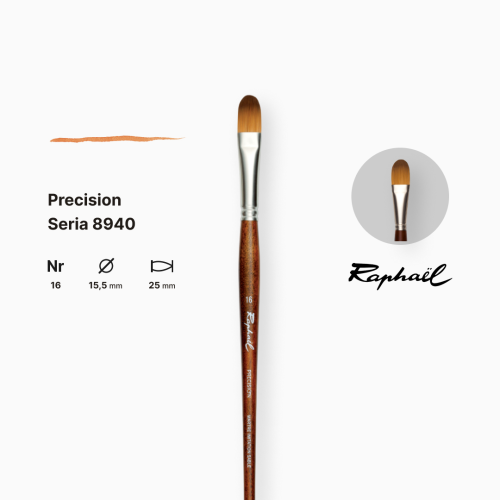 Кисть Raphael Precision овальная №16 (серия 8404) — профессиональный синтетический инструмент премиум-класса, который максимально близко имитирует натуральный колонок по упругости, впитываемости и контролю мазка. Специально разработана для акрила, масла и гуаши, когда нужны широкие заливки, мягкие переходы, текстуры и точная детализация даже в крупных форматах.