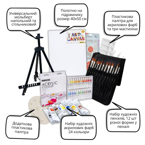 Данный набор объединил все необходимые материалы для рисования акриловыми красками.