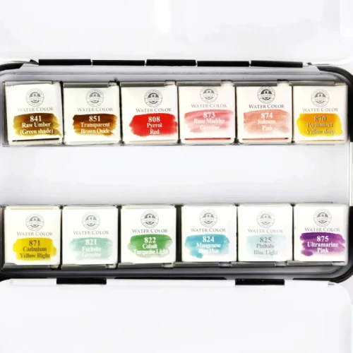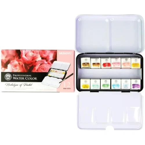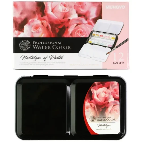 Набор акварельных красок GALLERY Nostalgia of Pastel от MUNGYO — профессиональная акварель в 12 нежных пастельных оттенках, созданная для художников, которые ценят тонкие, мягкие и мечтательные цвета. Краска изготовлена исключительно из высококачественного пигмента и гуммиарабика без лишних наполнителей — это обеспечивает максимальную интенсивность, чистоту и яркость оттенков, отличную растворимость и потрясающую реакцию при разведении водой.