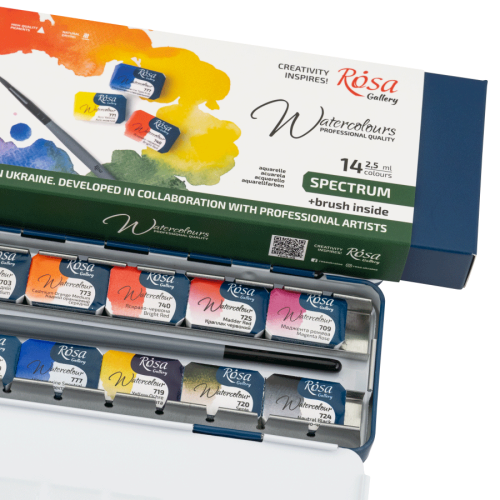 Набор профессиональных акварельных красок ROSA Gallery SPECTRUM на 14 цветов — это гармоничное сочетание классической палитры и современного качества. В наборе представлены традиционные акварельные тона, большинство из которых однопигментные, что позволяет получать чистые и прозрачные оттенки при смешивании.