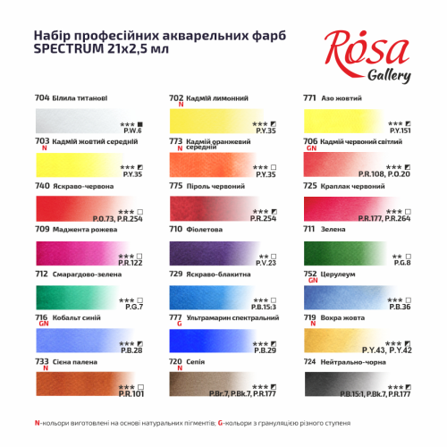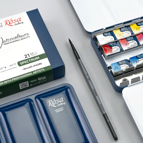Набор профессиональных акварельных красок ROSA Gallery SPECTRUM на 21 цвет создан для художников, ценящих качество и гармонию цвета. Палитра включает как традиционные, так и современные оттенки, большинство из которых однопигментные — это обеспечивает чистоту и прозрачность при смешивании.