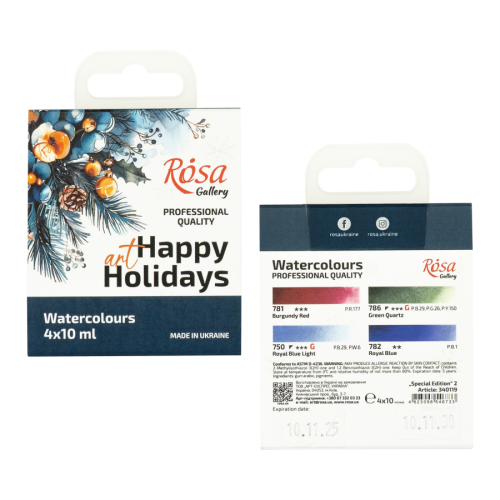 Лимитированный праздничный набор акварельных красок ROSA Gallery Special Edition №2 4×10 мл — специальная рождественская палитра для создания атмосферных, выразительных работ. Четыре цвета идеально подобраны для драматических пейзажей, иллюстраций и тёплых акцентов.