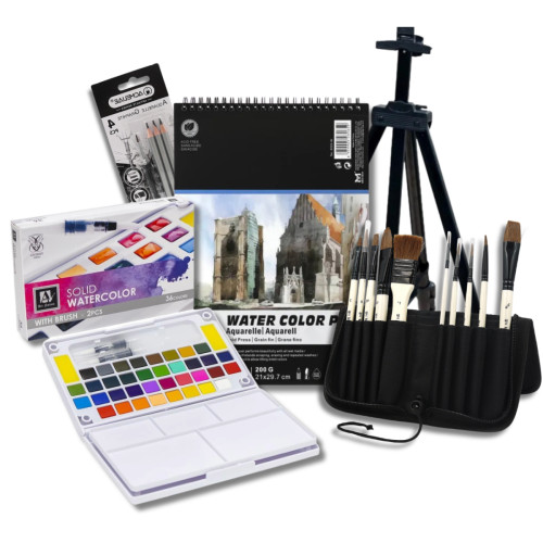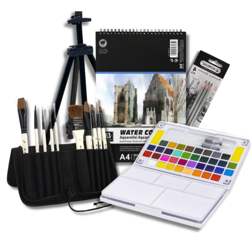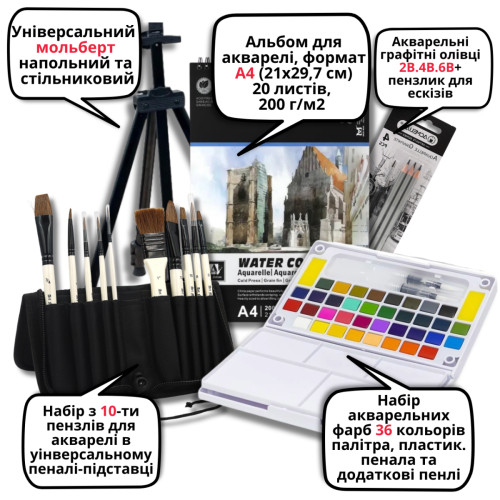 Этот художественный набор для рисования позволяет сразу приступить к творческому процессу. Комплект включает качественные акварельные краски, кисти из натурального волоса, специальный альбом для акварели, акварельные графитные карандаши для эскизов и удобный универсальный мольберт (настольный / напольный). Благодаря продуманной комплектации художник получает полноценный набор для акварельной живописи.
