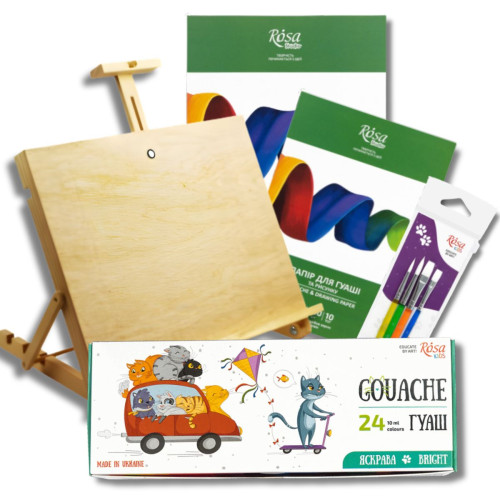 Настольный мольберт формата А3 с верхним зажимом позволяет удобно фиксировать бумагу разных размеров и помогает правильно организовать рабочее место ребёнка. Гуашевые краски ROSA Kids серии Cats отличаются яркими, насыщенными цветами, хорошо перекрывают поверхность и легко смываются с рук и одежды.