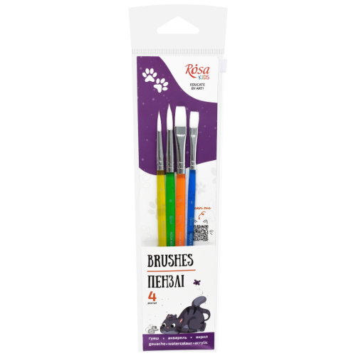 - Набор синтетических кистей ROSA Kids, 4 шт: круглая №6, №8; плоская №6, №10