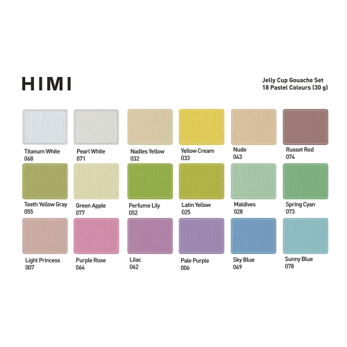 Пастельная серия HIMI отличается мягкостью тонов, хорошей укрывистостью и отличной смешиваемостью. Краски легко разводятся водой, после высыхания образуют красивый матовый бархатистый слой и могут быть повторно активированы водой. Большой объём каждого цвета делает набор экономичным и подходящим для длительной работы.