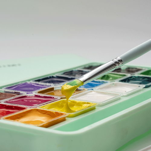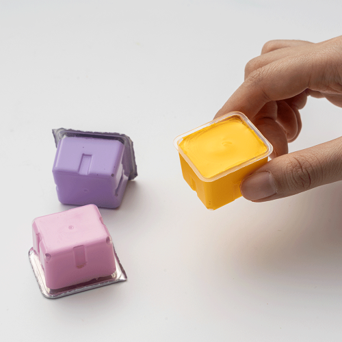 Откройте капсулу Jelly Cup и возьмите краску кистью. Для плотного цвета используйте её без разбавления, а для мягких переходов — добавьте немного воды. Если краска слегка подсохла, просто капните несколько капель воды. После использования плотно закройте крышки. Подходит для бумаги, картона, холста и художественных планшетов.