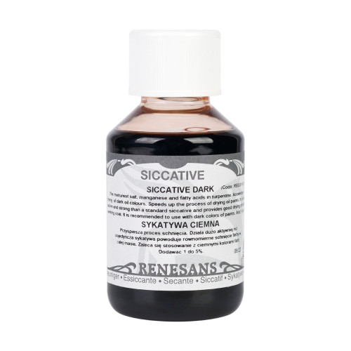 Сиккатив тёмный Renesans — специальный ускоритель высыхания для масляных красок. Смесь солей свинца и жирных кислот в скипидаре. Работает быстрее на поверхности лакокрасочного покрытия, затем в более глубоких слоях, обеспечивая равномерное и полное высыхание.
