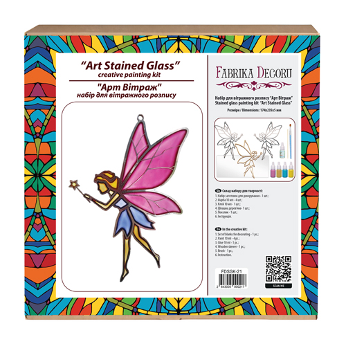«Фея / Fairy» — набор для витражной росписи от Fabrika Decoru, который переносит в мир волшебства и вдохновения. Изящная фигурка феи с волшебной палочкой станет чудесным украшением интерьера, придавая ему лёгкость и сказочность. Переливы прозрачных красок на свету создают магический эффект, превращая готовую работу в настоящую витражную миниатюру.