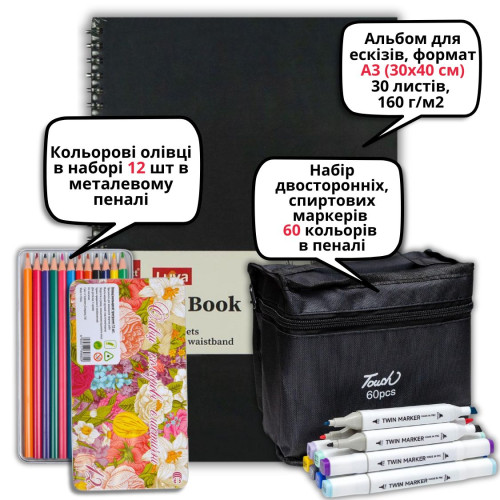 Подарочный набор для рисования «60 маркеров + 12 карандашей + скетчбук А3»
