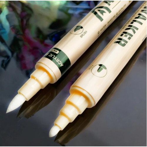 Профессиональный белый акриловый маркер AnYi с двумя наконечниками: тонкий аппликатор 1 мм для четких линий и гибкая кисть для широких мазков и мягких переходов. Идеально подходит для каллиграфии, леттеринга, скетчинга, декора и создания ярких акцентов на любых поверхностях.