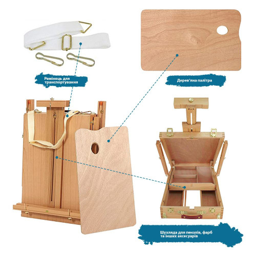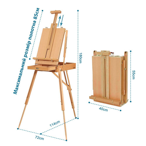 Изготовлен из прочной и износостойкой буковой древесины. Конструкция оснащена удобным деревянным лотком для хранения красок, кистей и аксессуаров прямо во время работы. Максимальная высота этюдника достигает 180 см, а высота полотна — до 85 см, что делает его универсальным для разных форматов. Легко регулируется по высоте и углу наклона, обеспечивая комфортную работу в любом положении.