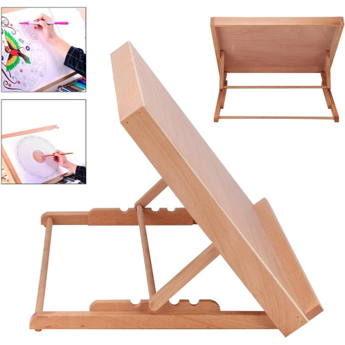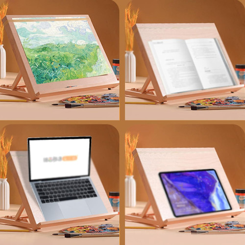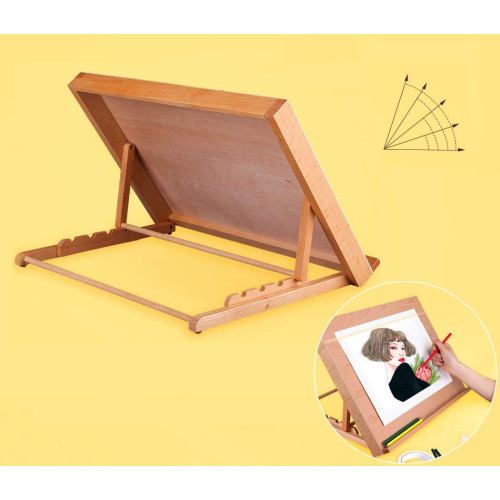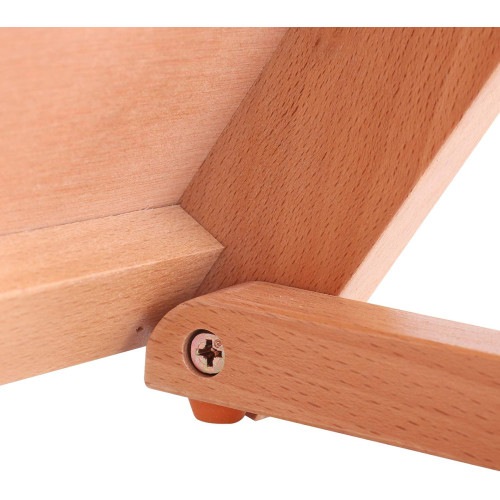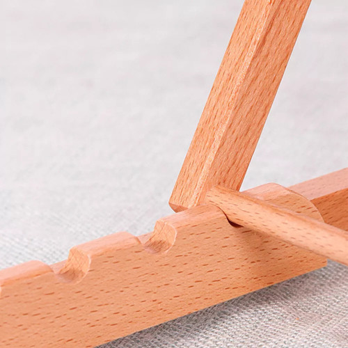 Рабочая поверхность: 47×36 см — идеально подходит для планшетов, холстов и бумаги формата А3+. Пять ступеней регулировки угла наклона позволяют работать в самом удобном положении — от вертикального до почти горизонтального. Нижний деревянный бортик надёжно удерживает лист или холст даже при максимальном наклоне, а резиновые ножки защищают стол от царапин и предотвращают скольжение.