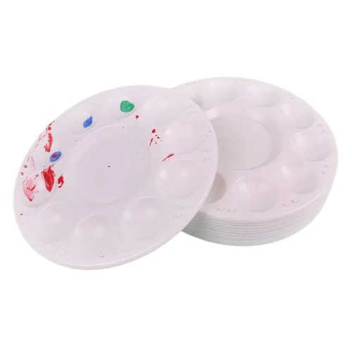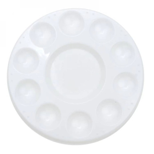 Компактная круглая художественная палитра из прочного белого пластика диаметром 17,8 см — идеальный выбор для работы с акрилом, гуашью, акварелью, маслом и темперой. Легкая, удобная, не впитывает краску и легко отмывается.