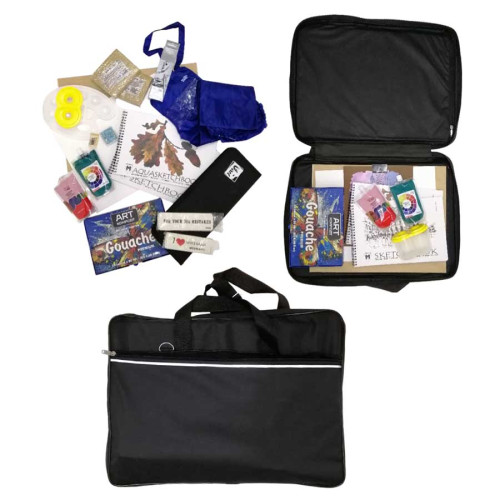 Внутри помещаются различные художественные материалы: гуашь, акварель, альбомы и папки для бумаги. Боковой карман на молнии идеально подходит для хранения кистей, карандашей и мелочей. Сумка выполнена из прочной ткани, которую легко очищать влажной обработкой, сохраняя аккуратный вид надолго.
