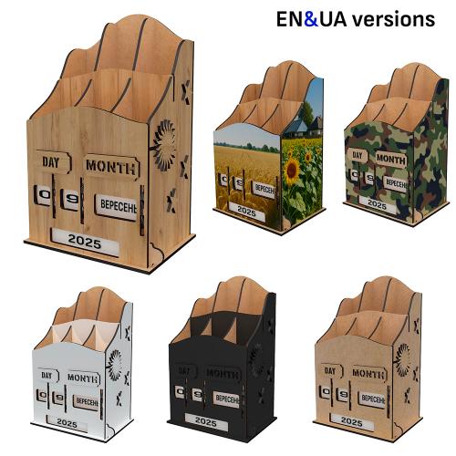Вечный календарь-органайзер №429 от Fabrika Decoru — это стильный и многофункциональный аксессуар, который сочетает практичность и эстетику. Он не только помогает всегда держать дату перед глазами, но и служит удобным органайзером для ручек, маркеров, кистей, косметики, мелочей или даже специй на кухне. Винтажный механизм на колёсиках позволяет легко устанавливать день, месяц и год простым вращением — никаких кубиков и лишних деталей.