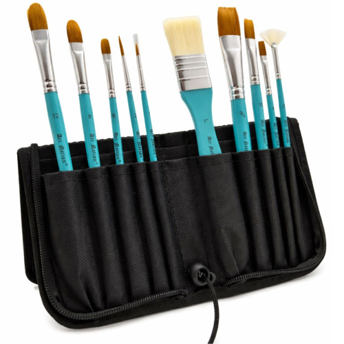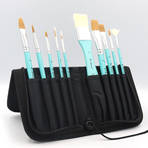 - Набір із 10 синтетичних пензлів різної форми в універсальному пеналі (Круглі, Пласкі, Лайнер, Овальний плаский, Скошений плаский, Віялоподібний)
