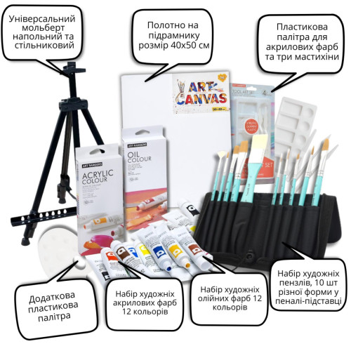У наборі зібрано все необхідне для старту: від мольберта до фарб і професійних інструментів для створення фактури. Це готовий комплект для малювання на полотні, який дозволяє одразу розпочати творчий процес.