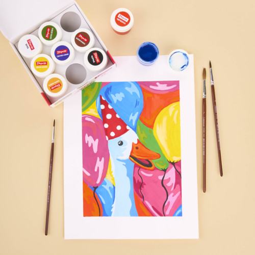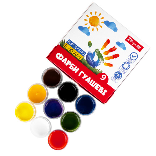 Палітра з 9 гармонійно підібраних кольорів ідеально підходить для уроків малювання, занять у гуртках і домашньої творчості. Гуаш легко змішується, створюючи нові відтінки, має однорідну текстуру, безпечний склад і не має запаху. Фарби легко змиваються з рук та одягу.