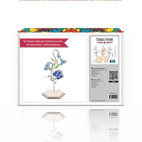 Art Glass — це сучасний підхід до вітражного розпису. Замість скла використовується прозора ацетатна плівка, замість пайки — лазерне різьблення по МДФ-основі, а замість складних технологій — проста техніка розпису за номерами. Фарби Deco Glass на водній основі самі вирівнюються всередині контуру, створюючи ефект «рідкого скла» з насиченими кольорами та глянцевим блиском.