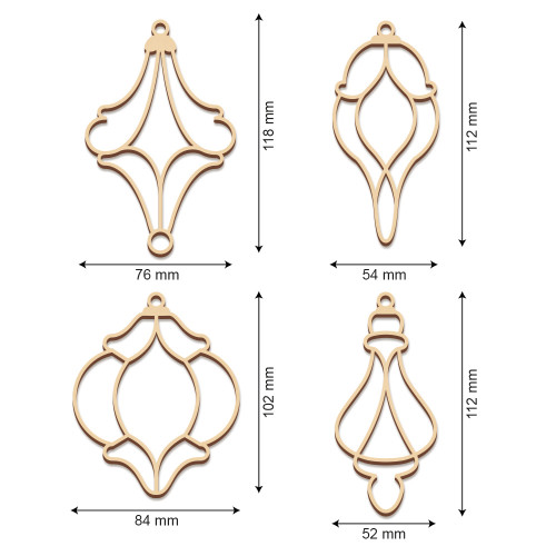 Размеры подвесок: 76×118 мм, 54×112 мм, 84×102 мм, 52×112 мм. Техника по номерам делает процесс понятным и приятным даже для новичков. Готовые украшения получаются лёгкими, прочными и долговечными — прекрасный вариант для семейного творчества, подарков ручной работы, ёлочных композиций и мастер-классов.