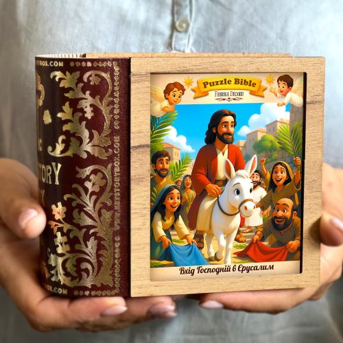 Набір пазлів «Вхід Господній в Єрусалим» (Puzzle Bible) — сюжетний дерев’яний пазл із серії KeyStory / Puzzle Bible. Ілюстрація відтворює урочистий в’їзд Ісуса Христа в Єрусалим і допомагає дітям у легкій формі познайомитися з важливою євангельською подією.