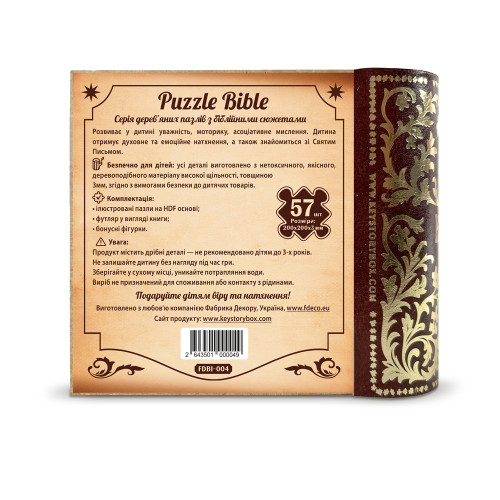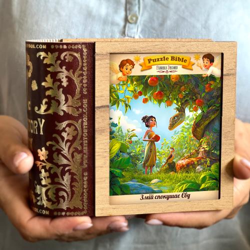 Набір пазлів «Змій спокушає Єву» (Puzzle Bible) — сюжетний дерев’яний пазл із серії KeyStory / Puzzle Bible. Ілюстрація передає момент спокуси в Едемському саду і допомагає дітям зробити перші кроки у вивченні Біблії, обговорюючи важливі теми вибору та відповідальності. Гра розвиває моторику, увагу й логічне мислення, подаючи біблійний сюжет у красивій та пізнавальній формі.