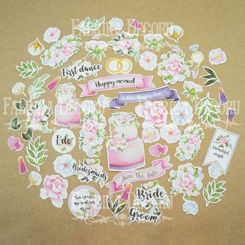 Набір паперових висічок для скрапбукінгу, які виготовлені з високоякісного європейського паперу, без кислоти і лігніну, щільністю 250 г/м2. У наборі 65 штук. Розмір елементів від 2 до 12см. Висічки є доповненням колекції "Wedding of our dream" від тм «Фабрика декору».