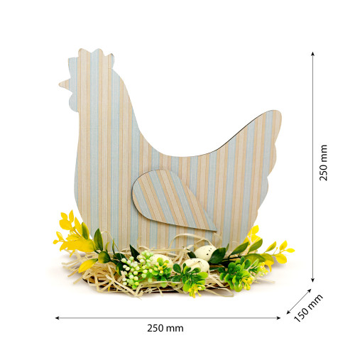 Інтер'єрна декоративна композиція «Пасхальна Курочка» — готова настільна композиція з милою курочкою та об'ємним флористичним декором, яка миттєво наповнює простір світлим весняним настроєм і передчуттям Великодня. Виріб повністю готовий до використання: достатньо встановити фігурку на здвоєну підставку з МДФ, що входить у комплект.